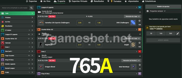 O 765A oferece uma grande seleção de opções de apostas em e-sports com probabilidades competitivas